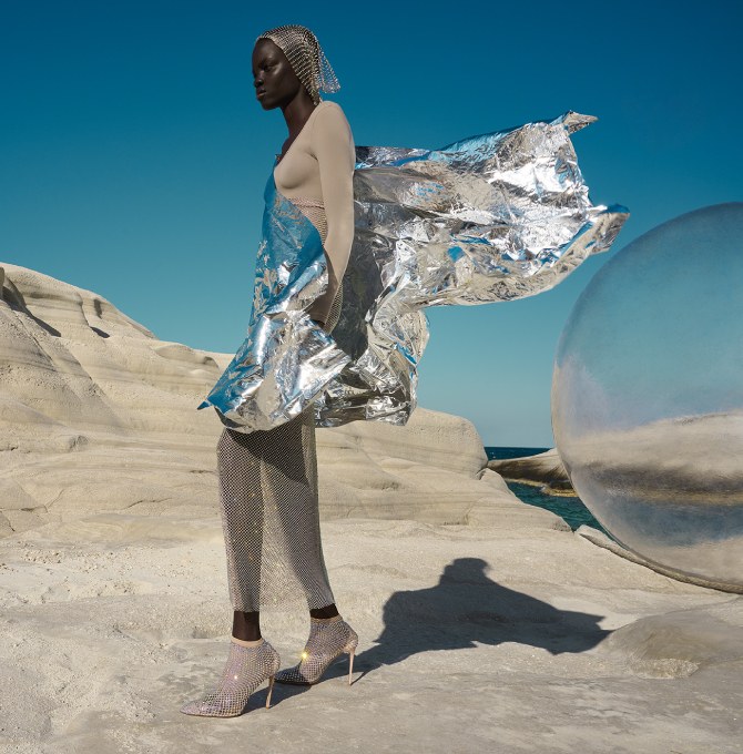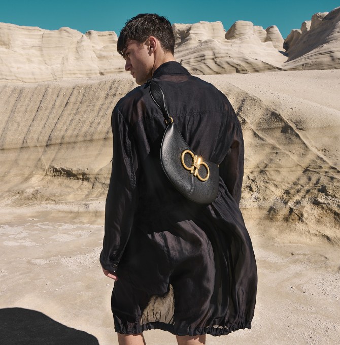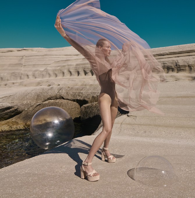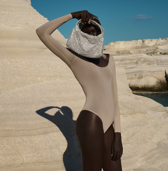 For the ‘NOMADS’ video and photo series, KALOGIROU traveled to the island of Milos. Taking advantage of the enchanting scenery of Sarakiniko, which was transformed into a "white" desert made of sand, sun and chalk-white rocks smoothed and shaped by time, wind, and waves. The atmosphere is overwhelming, like a ritual in progress. Nomads – in search of their Oasis - are drifted apart and swept away by a maelstrom of desires. They find each other but only briefly, for a moment. The domes preserve the oxygen, the source of life, and are portrayed as protectors of the flower of hope. Each frame of the campaign masterfully describes a story of sharp aesthetics.
